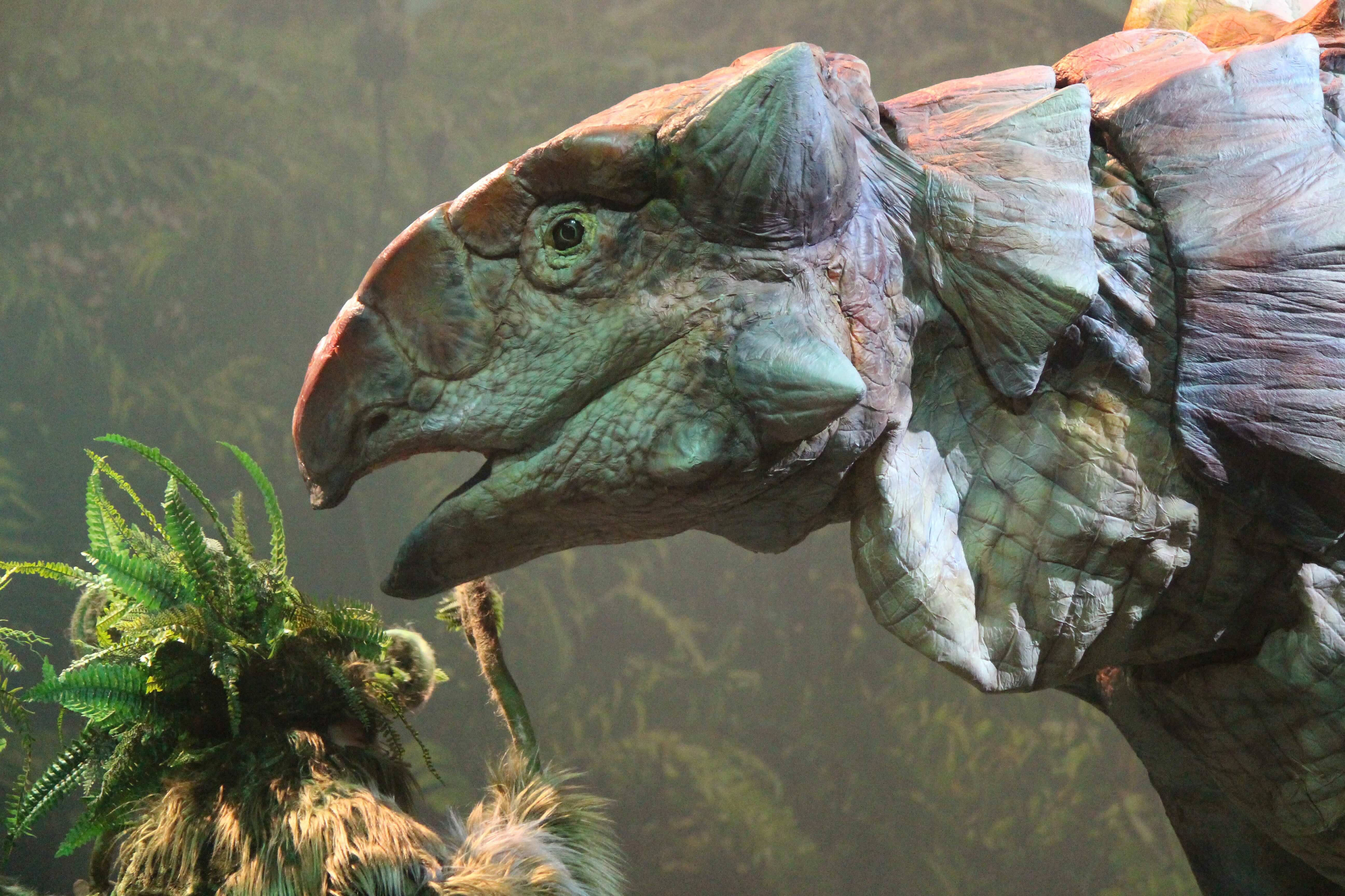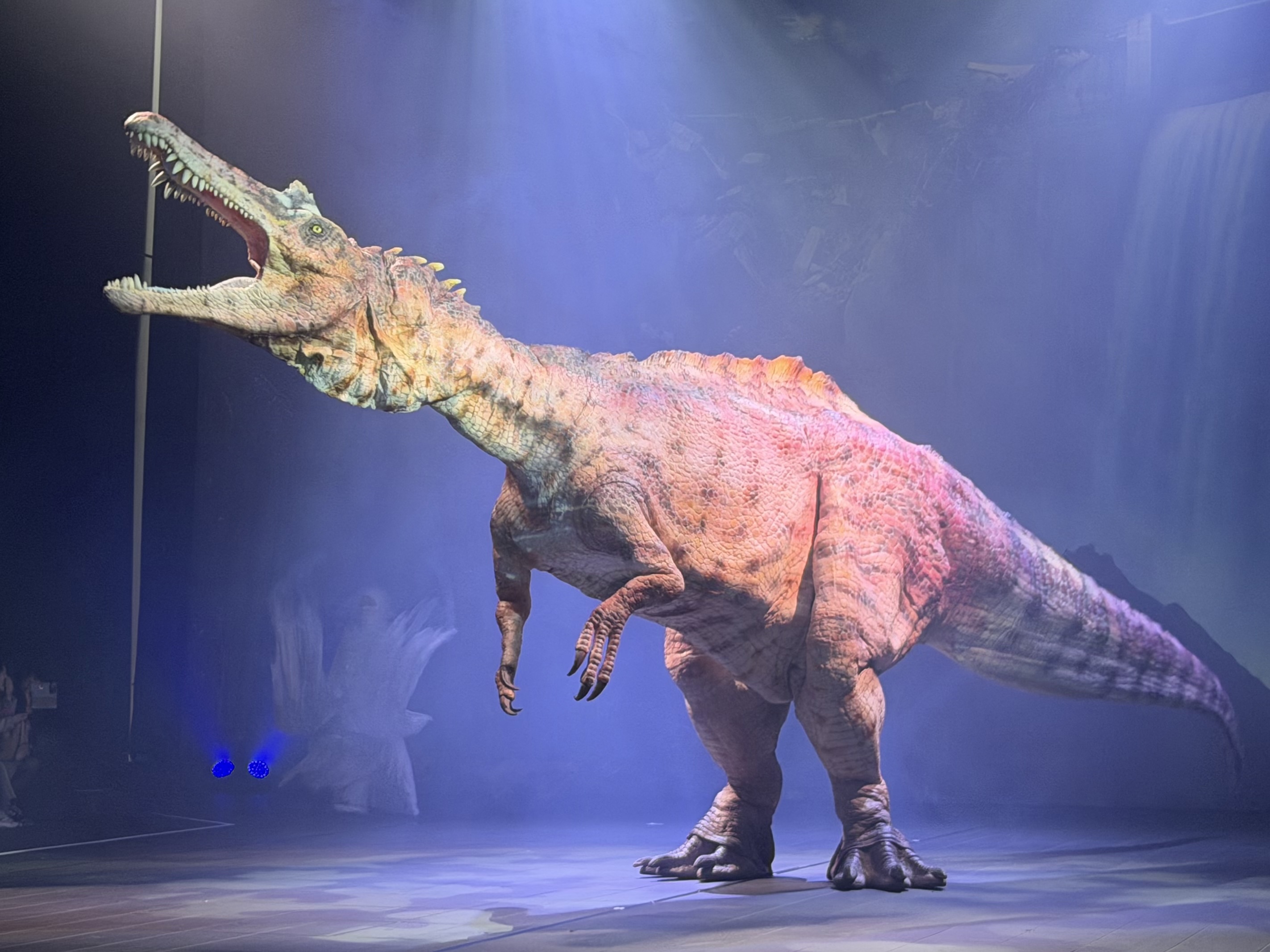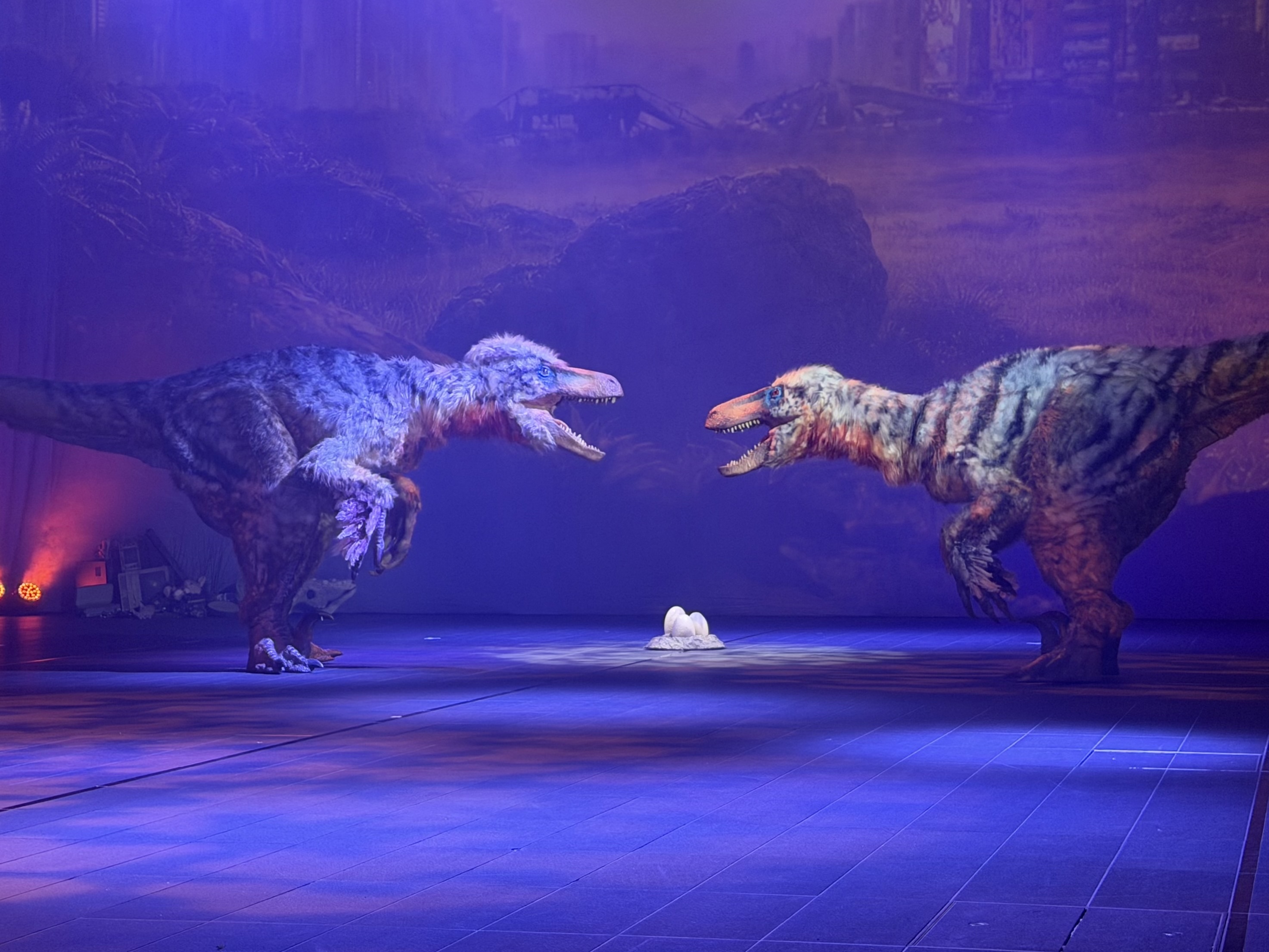 昨年12月の「恐竜大夜行2025」が東京国立博物館の野外を舞台にしたのに対し、今回のステージには観覧車のような骨組みが立ち、恐竜と人工物が同じ空間に混在する。どこか未来的でありながら、やがて隕石落下を示唆する展開へと向かう。白い衣装をまとった存在が風や水のように舞い、恐竜と絡み合う。時代も関係なく、境界もない、不思議な舞台。植物を象徴するキャラクターが恐竜と絡み合うシーンも、観客をひきつけた。