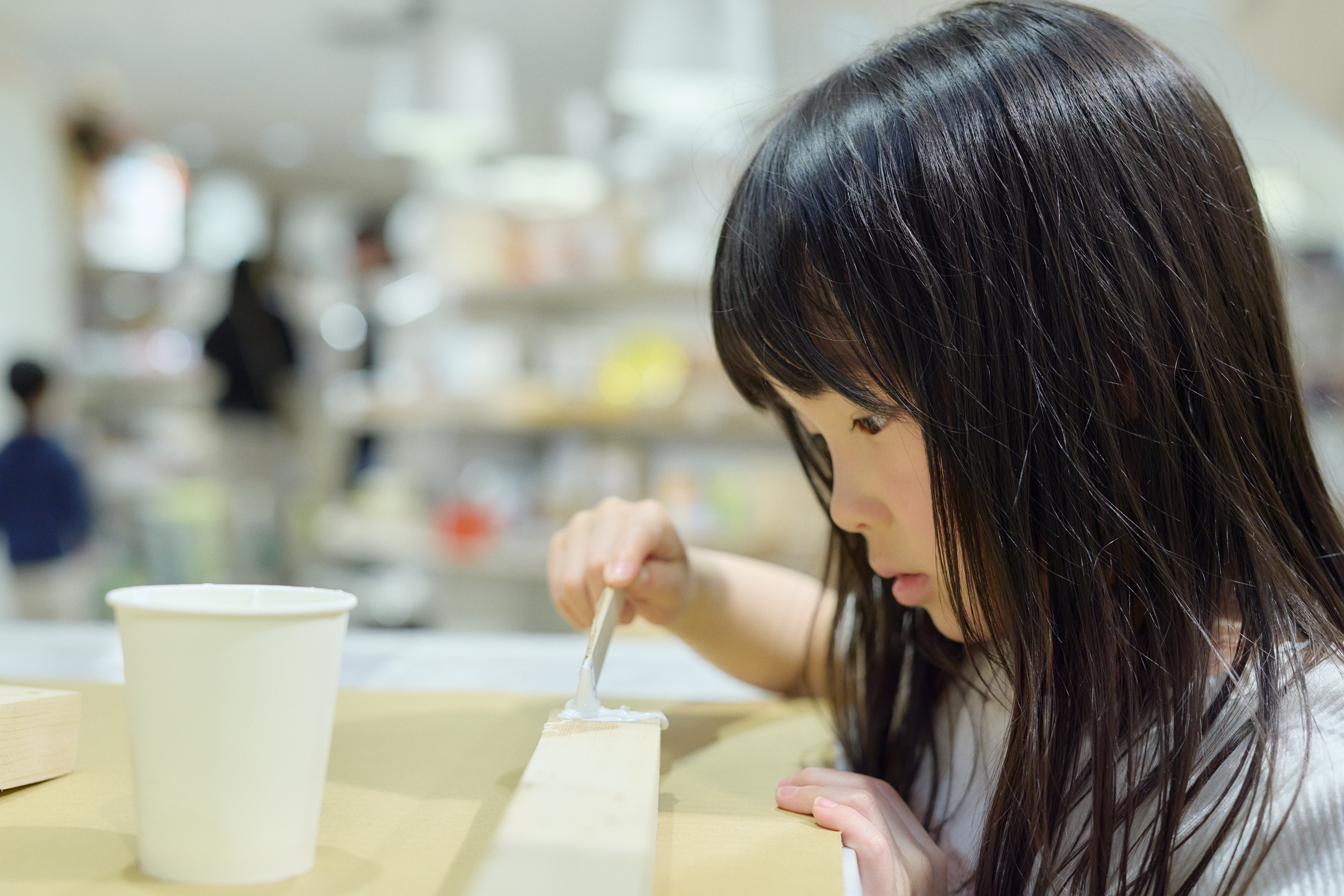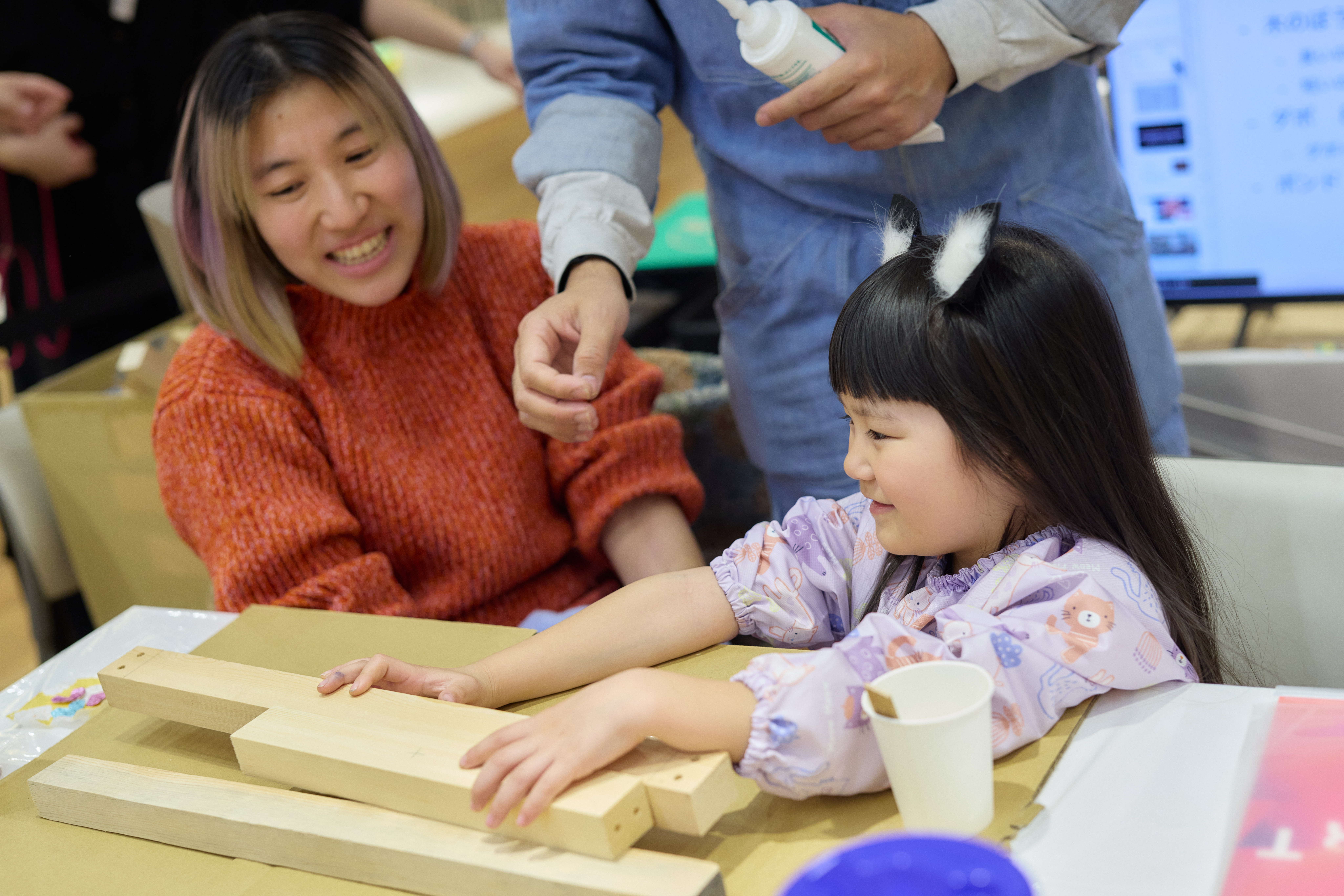ものをつくることは面白い。なかには子供を見守りながら「もっと角を綺麗にしなきゃ」と親のほうが夢中になってしまう場面も。それぞれの関係性のなかで共同作業が進んでいく。