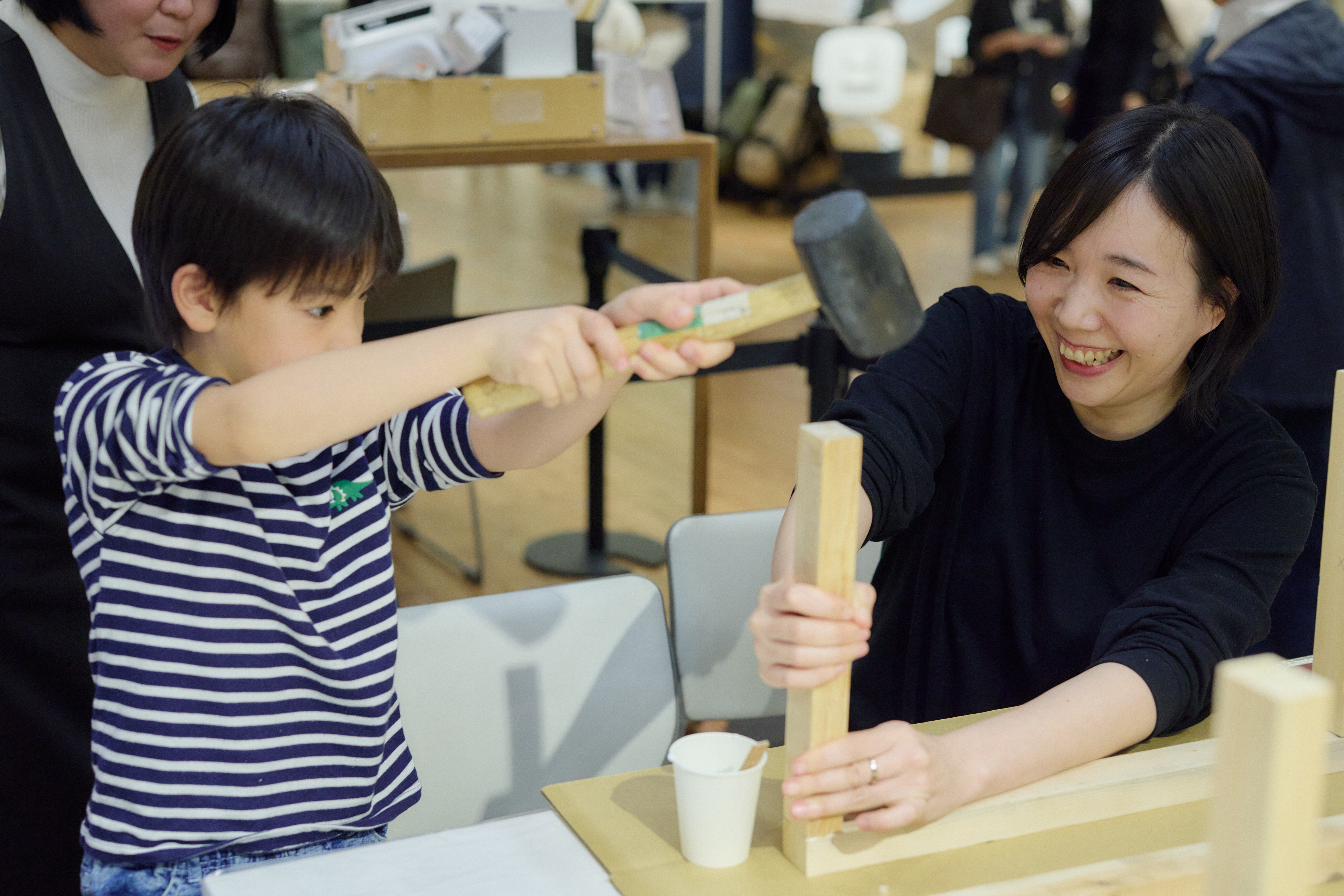 「うまくはまらなかったら、ハンマーでトントンして下さいね。景気よく叩いて大丈夫ですよ。親子のコラボレーションですからね」