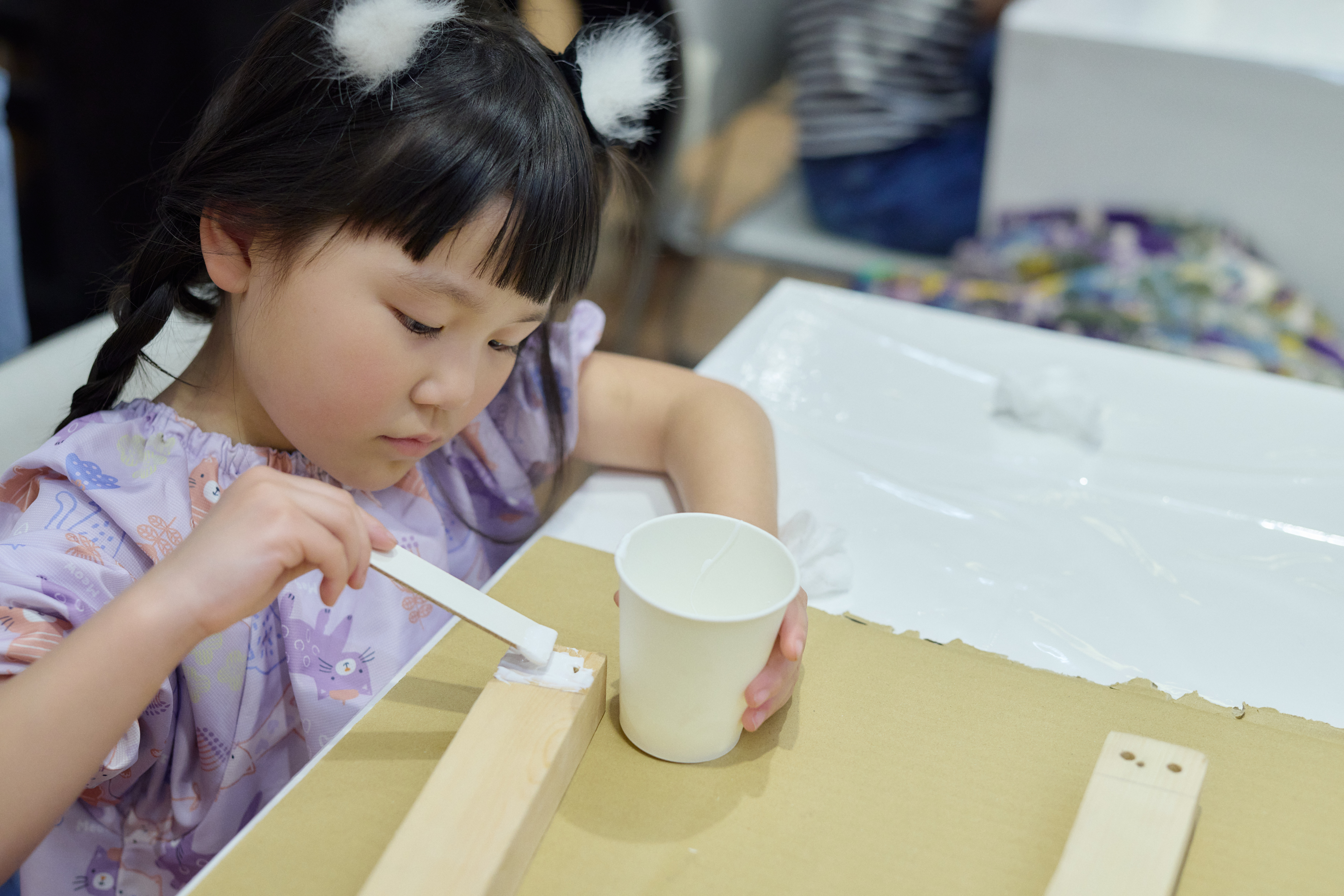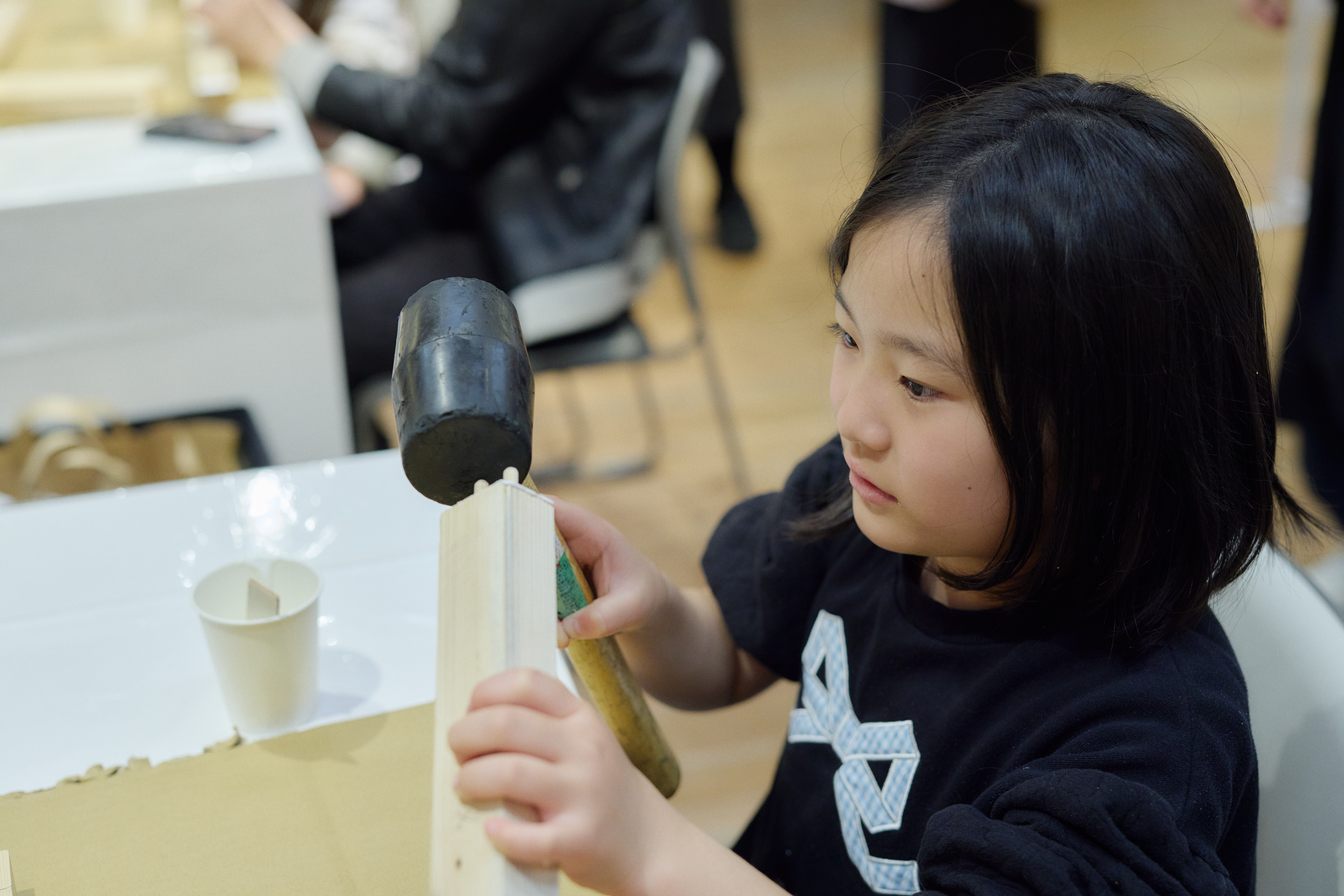 材料として配られた木材の穴に、ボンドを付けた小さな棒(ダボ)を入れて、木材と木材をつなぎ合わせていく。普段見かけない道具であるゴムハンマーが登場して、子供たちの目がキラリと輝く。
